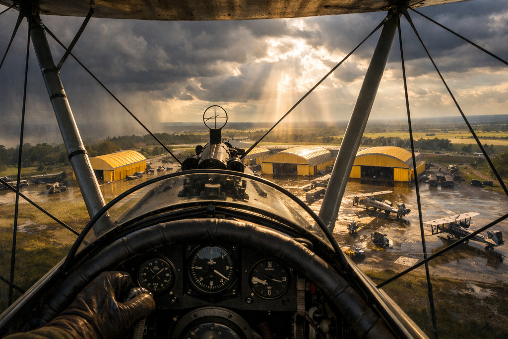 From an altitude of approximately 500 feet, Goddard observed the airfield. According to his prior knowledge and official records, the site was derelict. The hangars were expected to be roofless and the grass overgrown. However, the visual data contradicted these records. The hangars appeared repaired with new yellow roofs. The grass was neatly mowed. Several aircraft were positioned on the ground. Goddard identified them as Hawker Fury fighters, painted in yellow training livery. This configuration did not exist in 1935. The Royal Air Force did not adopt yellow training paint schemes until 1938.