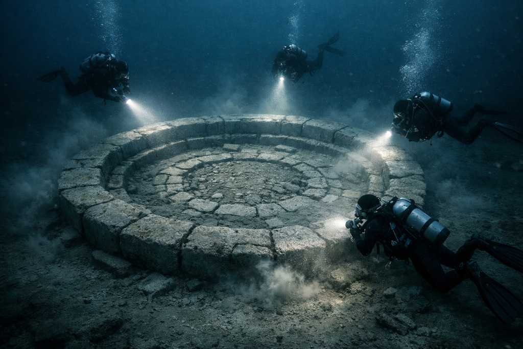 The sonar image displayed a circular formation roughly 60 meters in diameter. A linear track extended behind it across the seafloor, as if the object had moved before stopping. The shape did not resemble a conventional wreck. It appeared symmetrical, with raised features and sharp edges inconsistent with natural rock formations according to the divers’ preliminary statements.