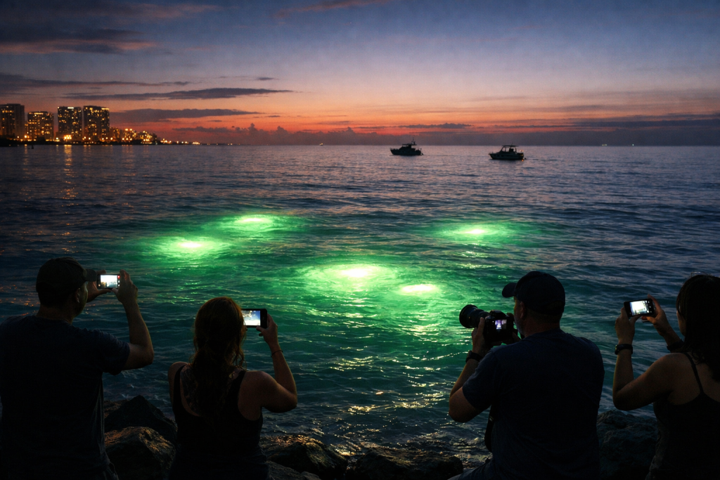 Eyewitness submissions came from a wide range of observers: commercial and recreational mariners, coastal residents, and users of marine tracking applications. Many reports described bright glowing entities beneath the ocean surface. One commonly shared description involved two green lights moving just below the water near Fort Lauderdale, Florida, captured in a brief video clip that circulated widely among online maritime communities.